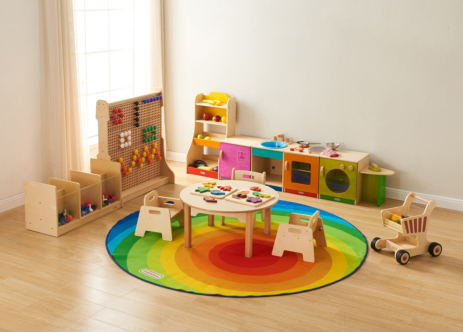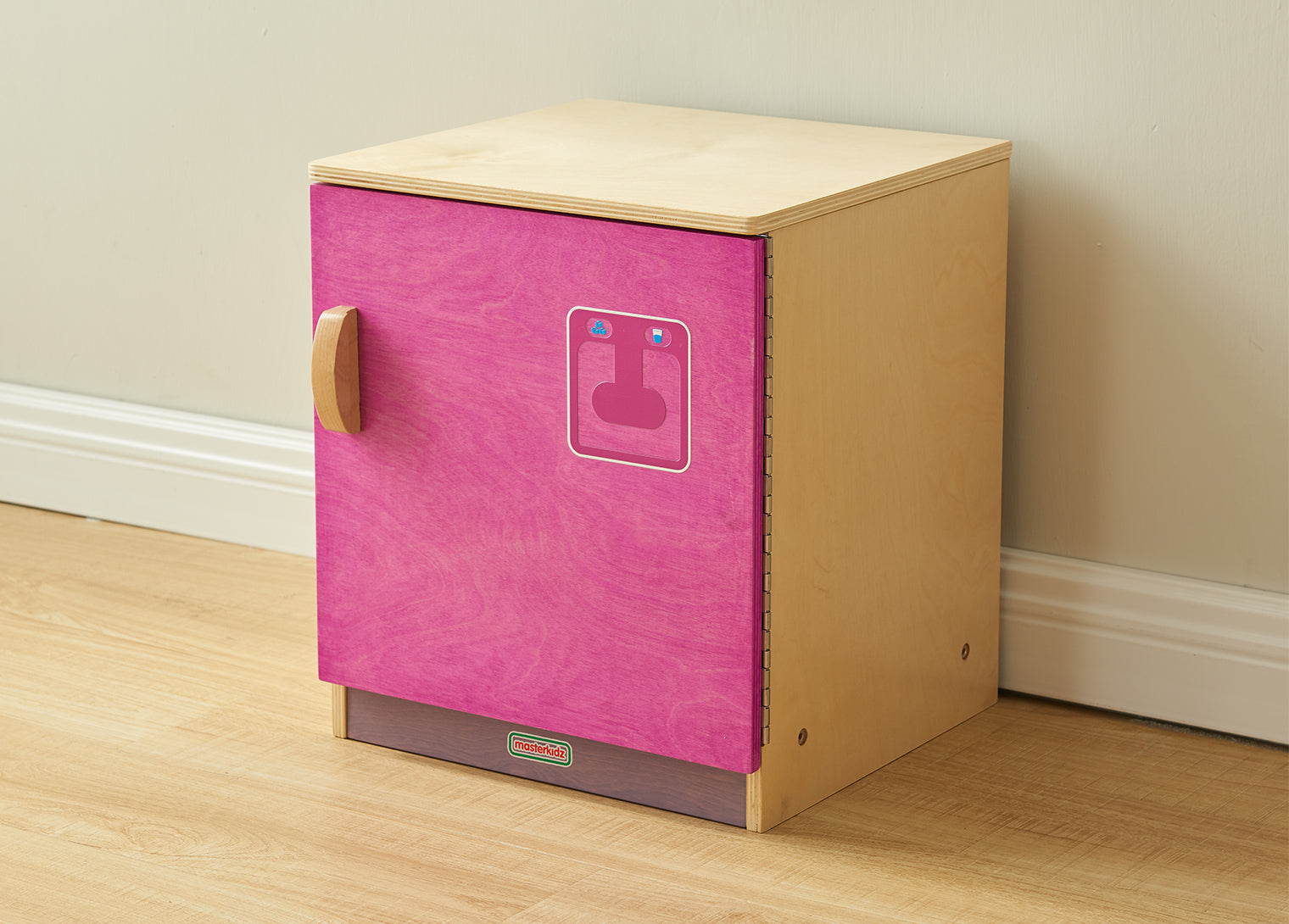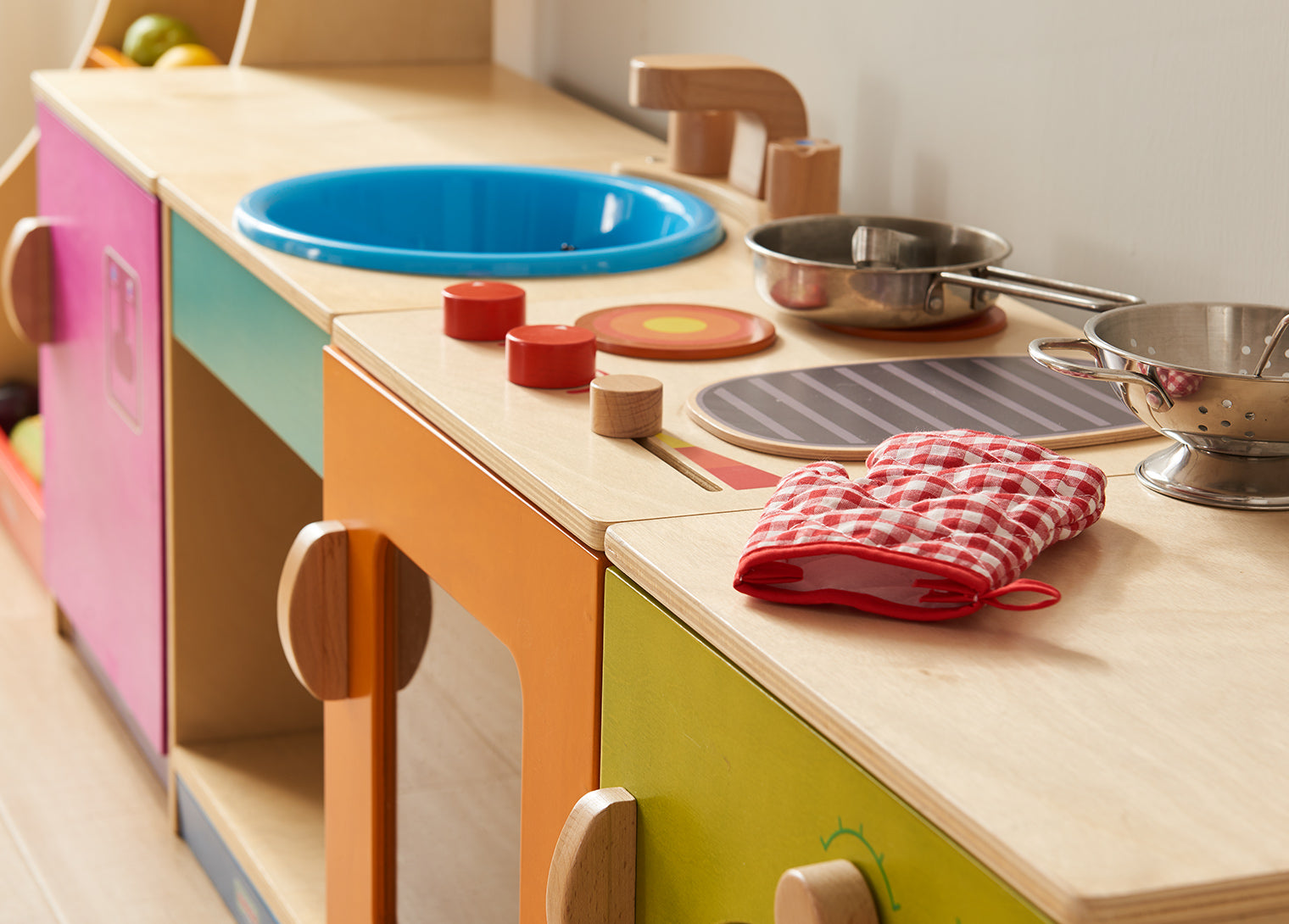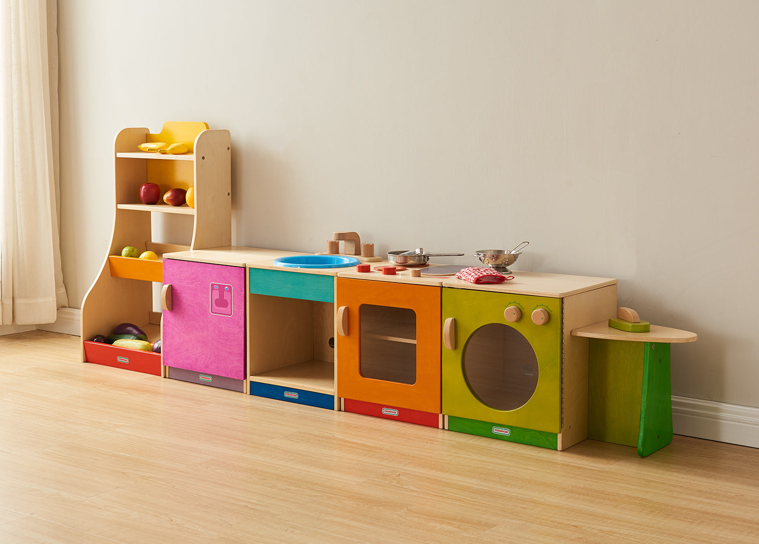 快樂角色扮演系列包含6個組件,提供一個完整的家居遊戲角,並附帶一些優秀的配件,讓角色扮演活動更加豐富。這個設計提供了最大的遊戲價值,從購物開始,延伸到食物準備、儲存、烹飪、清洗,甚至熨燙!所有物品均由實心硬木製成,經久耐用,並以一系列現代色調設計,既可區分各個組件,也可將它們作為一套搭配使用。廚房設備的表面高度專為學齡前兒童設計。這套組合包括一個市場攤位用於存放雜貨、一個購物車、一台冰箱、洗碗槽、爐灶(帶有爐台和烤箱)、洗衣機和熨燙組。各類玩具食品、餐具、工具和角色扮演服裝均可單獨購買。
