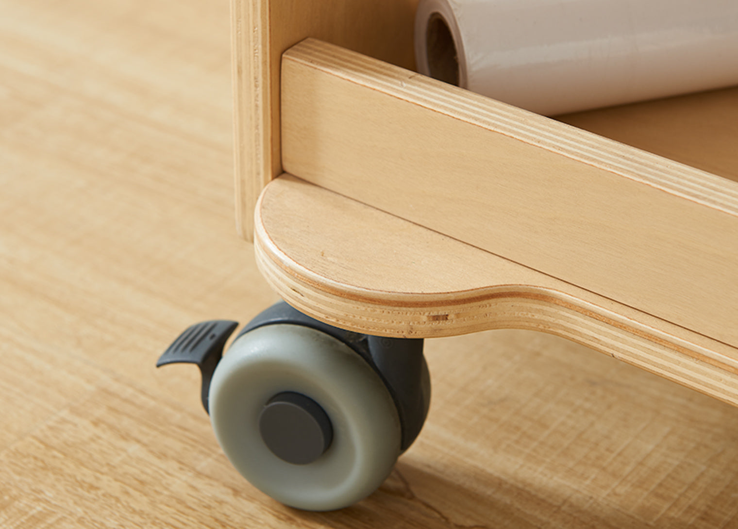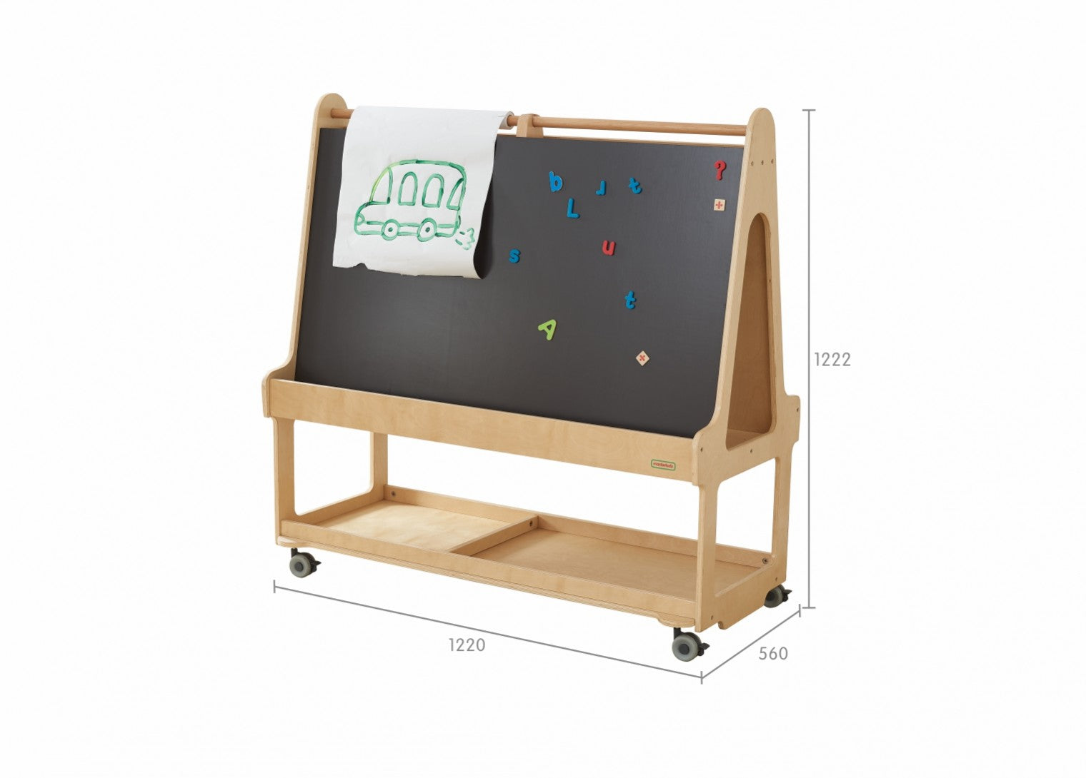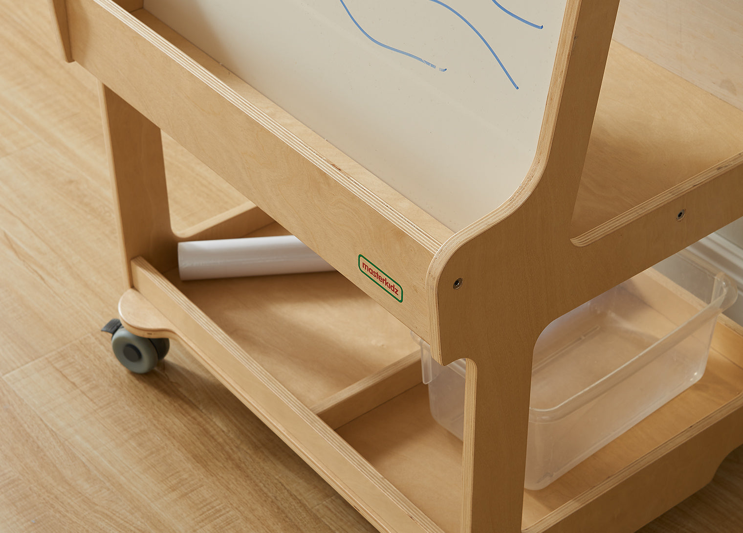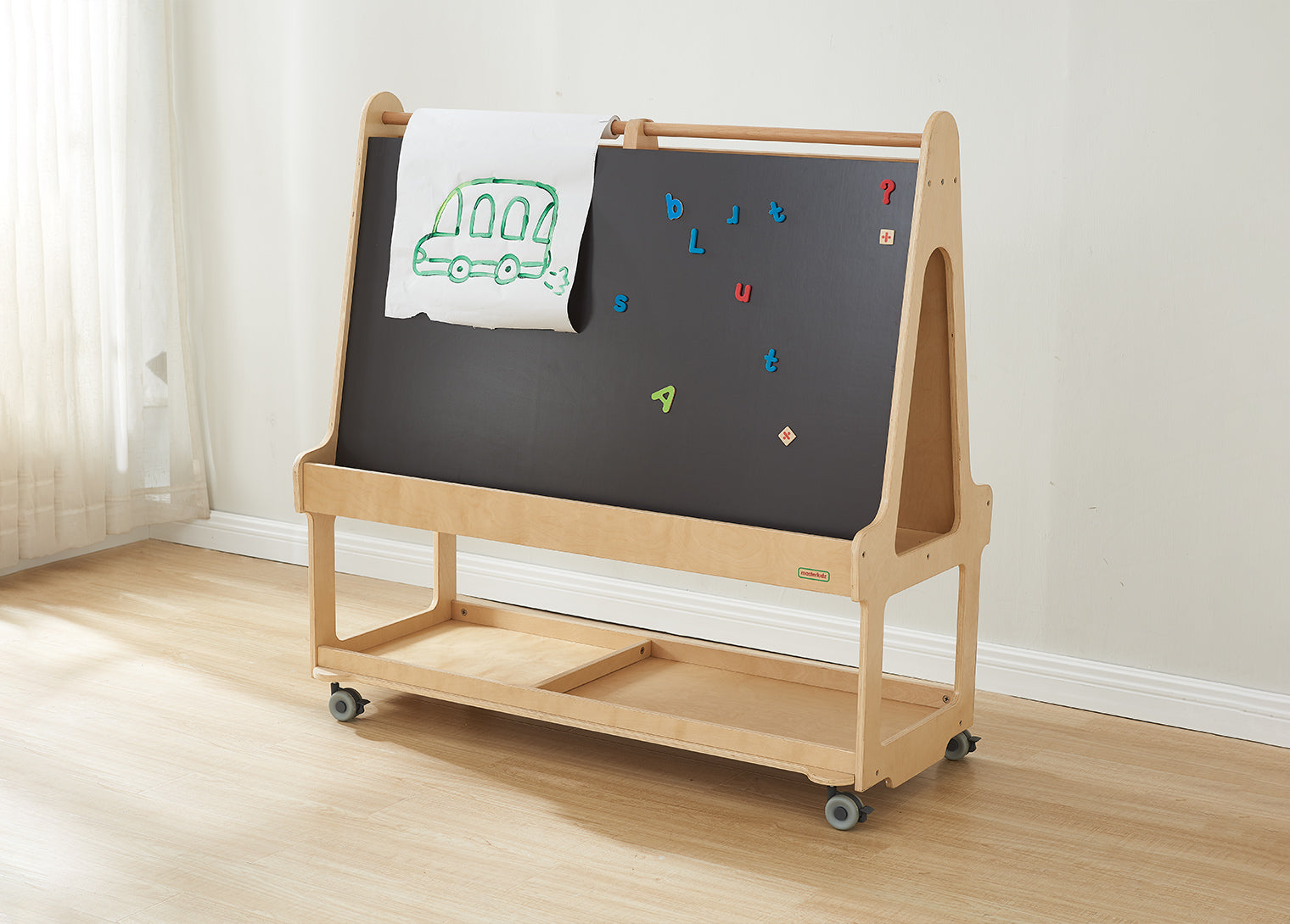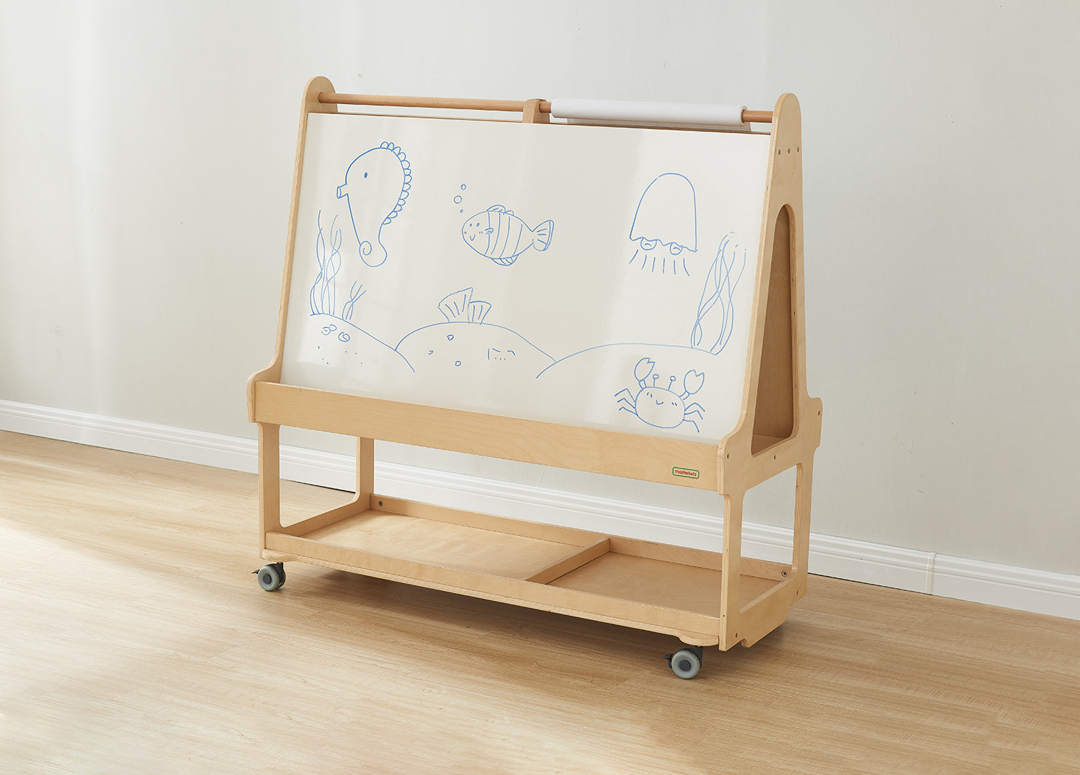 這款大型移動式畫架足夠讓小組的孩子們同時進行創作。它配有雙面畫架,一側是磁性黑板,另一側是可書寫擦拭的白板。孩子們可以即興創作,隨後輕鬆擦掉並再次使用。裝置頂部設有木質軸,可拉開紙卷進行藝術創作並保存作品。寬敞的A型底座帶有可鎖定的腳輪,使用時穩定且方便移動,可在教室內或天氣允許的戶外使用。畫架下方有充足的儲物空間,用於放置各種美術材料,並在便於取用的高度設有畫具槽,可放置顏料杯、畫筆、磁性字母和水杯。該裝置由美觀的夾板製成,邊角圓潤,並塗有高度耐擦拭的清潔漆。